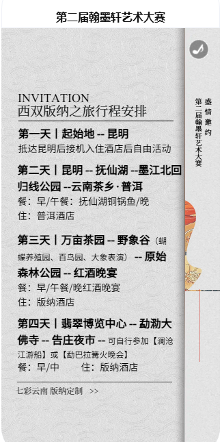 为促进书画交流,感悟云南风情,提升艺术素养,弘扬中华文化。应广大书画爱好者要求,本公司将举行《墨韵之旅.云南站》第二届文化艺术交流峰会七天六晚游学之旅:“七彩云南,美韵之旅”